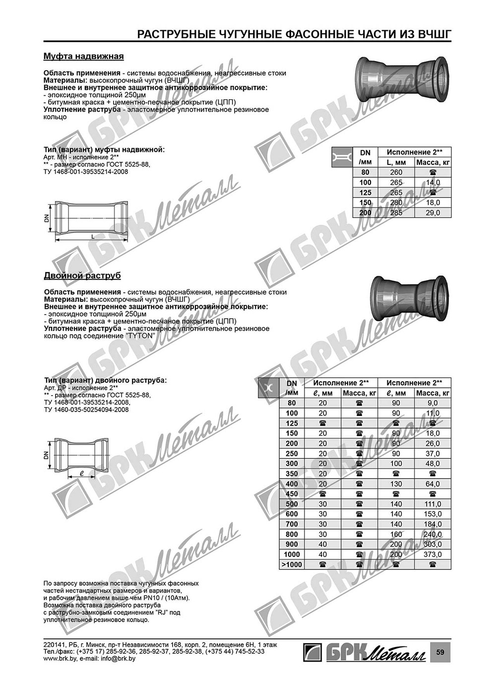 • • Муфта двойная универсальная для чугунных, стальных, ПВХ и асбестоцементных труб