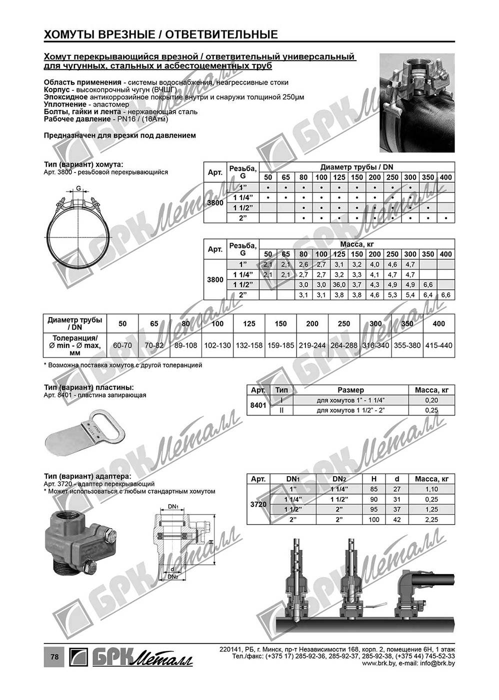 • • Хомут перекрывающийся врезной/ответвительный универсальный для чугунных, стальных и асбестоцементных труб